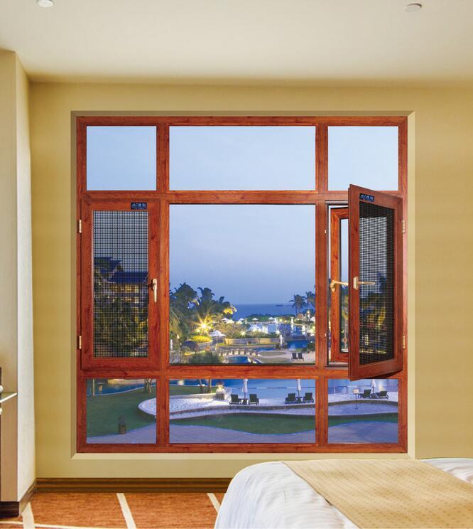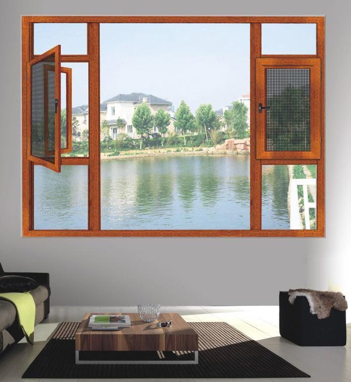 5.内置高强度金刚纱网,框架中间是防护围栏,集照明,安全,防虫,防盗多功能平开窗于一体,美观高端,节约空间。