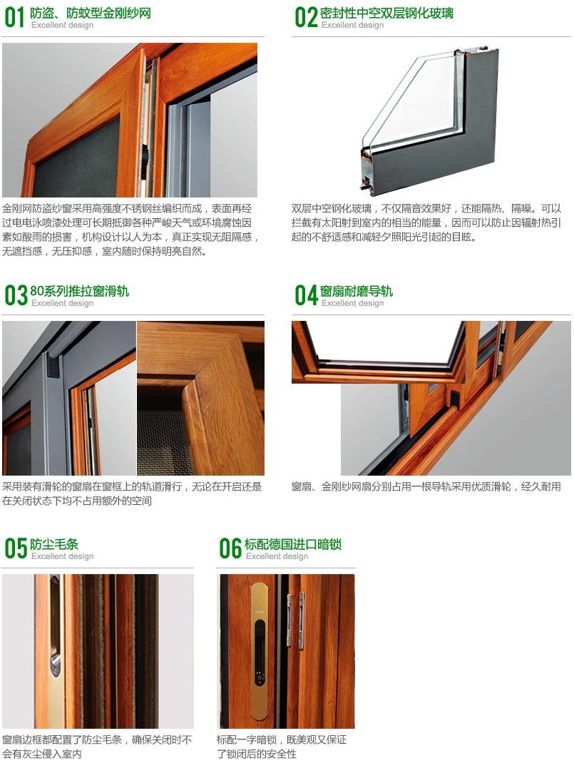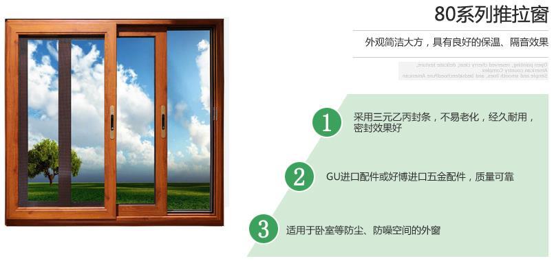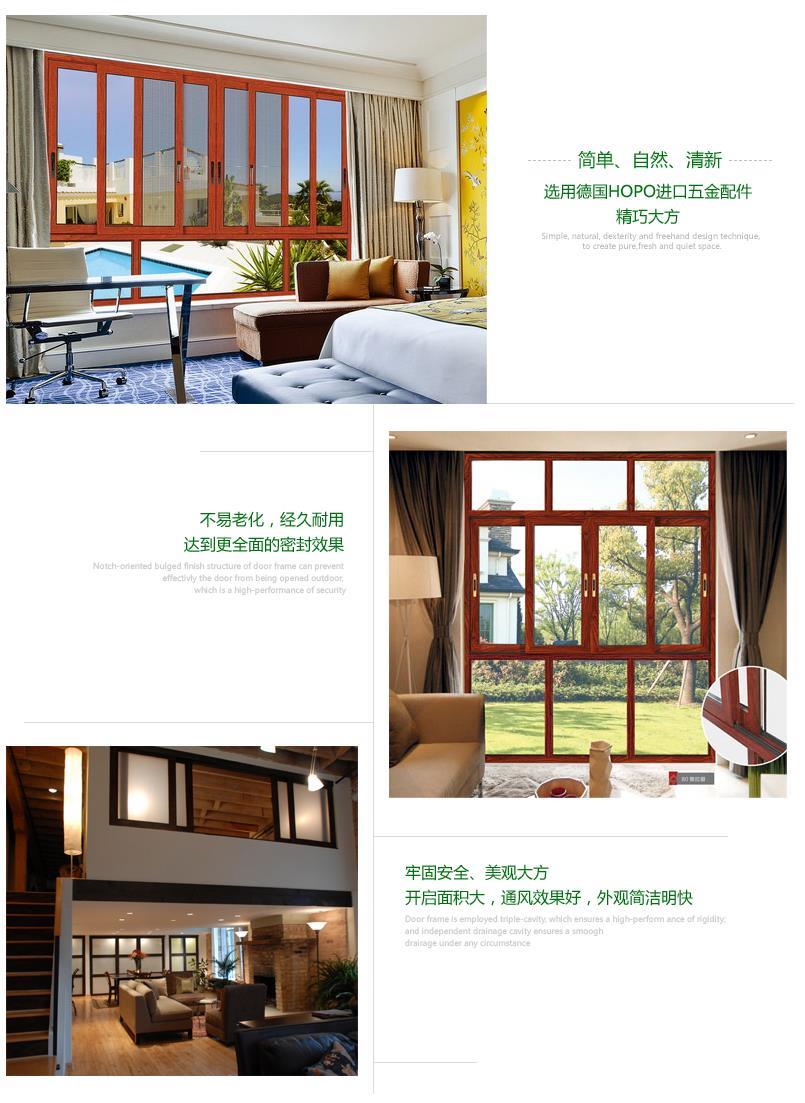 5.机能概述:适用于门窗。它可以配备侧开式防盗屏风。当外面推拉扇和平开纱扇处于收缩状况时,可以防范盗窃和通风。敞开平开纱扇时,外推拉可以自由滑动;